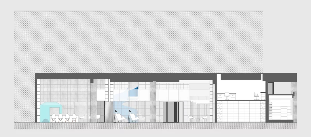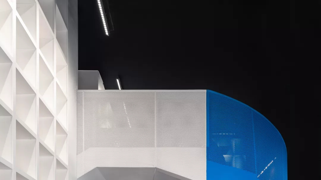 我用蒂芬妮藍(lán)閱讀屋作為女性盒子的中心,與此呼應(yīng)的是入口可見的卡萊茵藍(lán)螺旋樓梯,以及盒子背面室外的明黃色兒童活動場地。他們精致地鑲嵌在有些迷離模糊的空間中成為點(diǎn)睛之筆。如果社區(qū)客廳藏在陳詞濫調(diào)的商業(yè)里面之后,就失去了示范作用。有空客廳的立面就是一個打開的盒子,高4米的半開門是穿孔鋁板制作的,形成了Wutopia Lab標(biāo)志性的半透明界面。你能從這里隱隱約約的窺看到,溫暖的燈光,明亮的藍(lán)色,和孩子的笑聲。