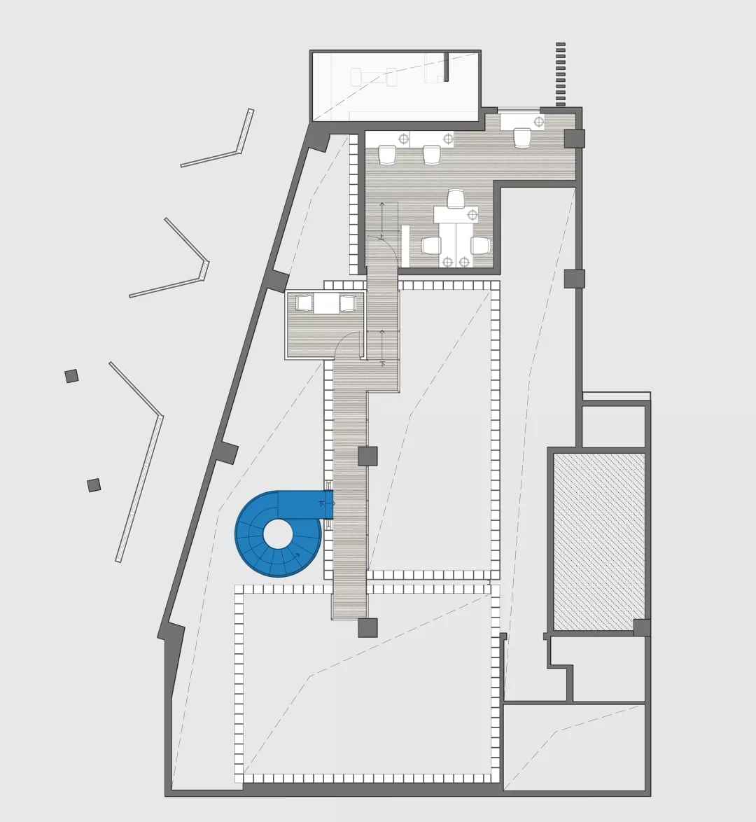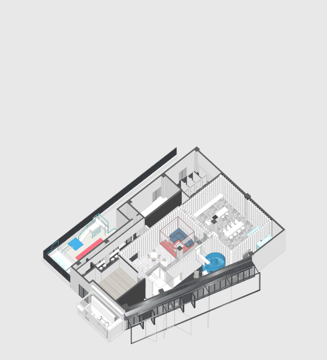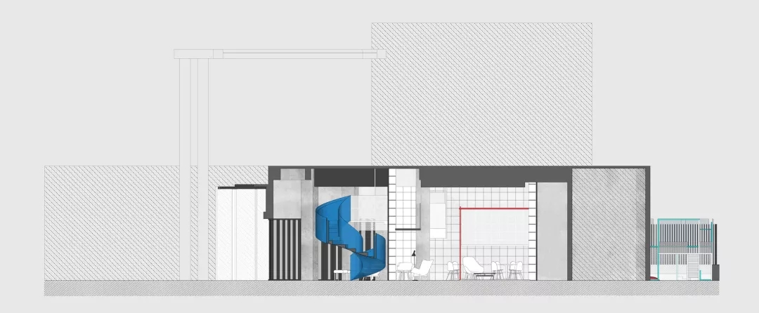 我們設(shè)計了一個夾層走廊隱藏在書架上.在課題研究中如何利用層高一直是房產(chǎn)商關(guān)心的,以我的實(shí)際經(jīng)驗,凈高2.1米仍然具有一定舒適度。在本案中,原本懸在社交盒子上的麻將房因為一樓層高過低無法成立,于是我們直接切斷,形成一個小陽臺作為暗示。