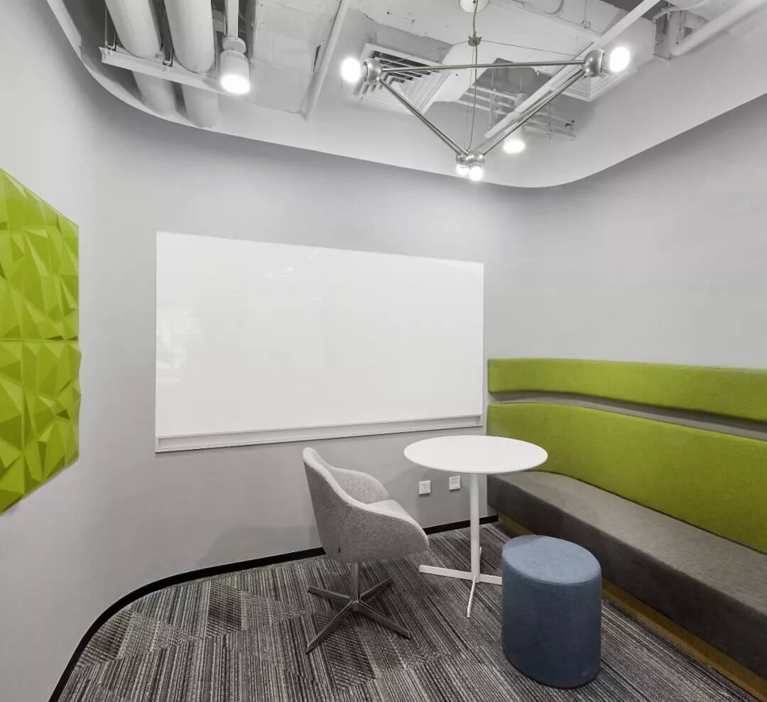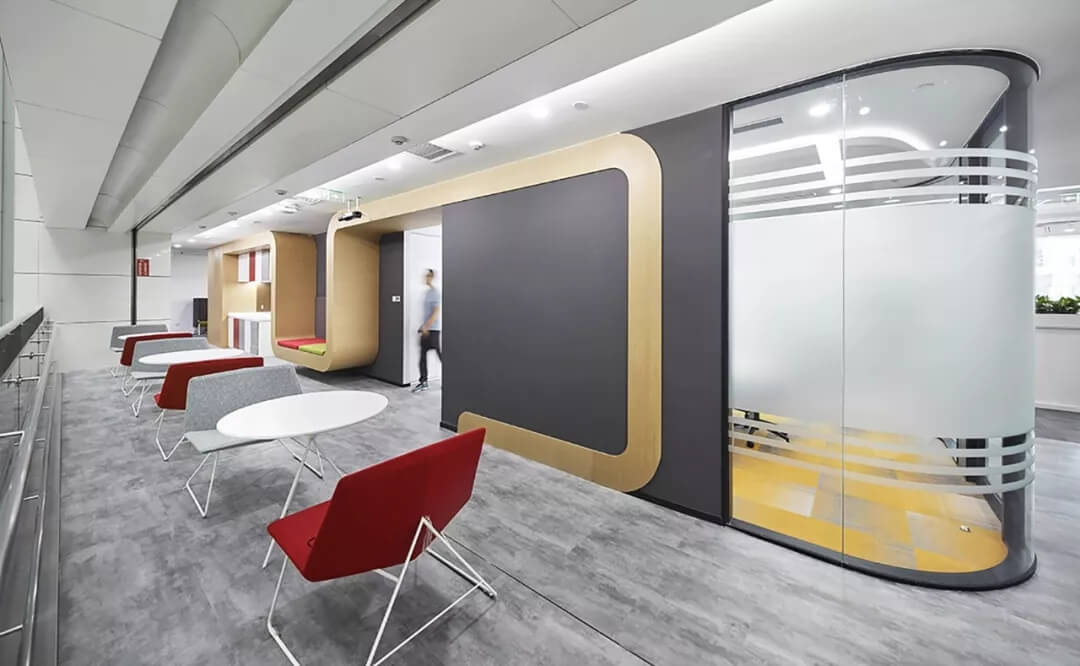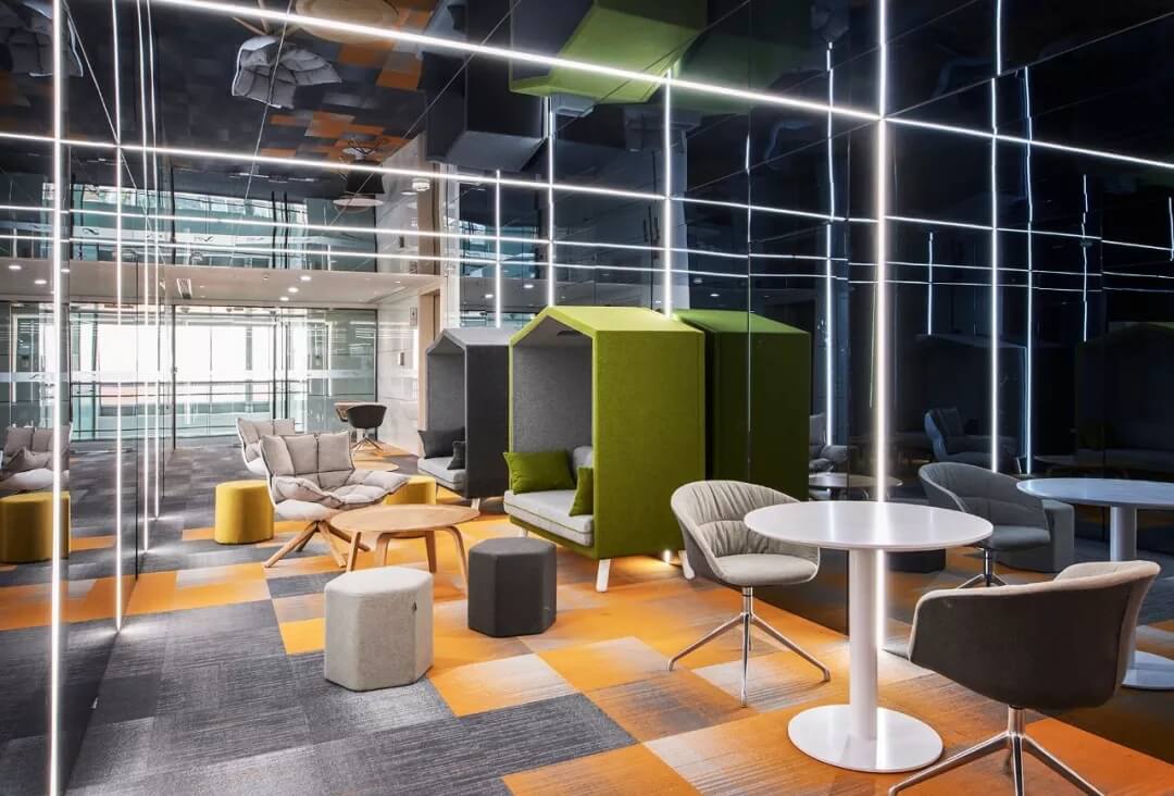 在軟裝設計上,該區(qū)域家具軟裝及墻壁,選擇明快的色調,展示青春活力,并且用黑色烤漆玻璃內嵌燈帶的方式營造氛圍,透著數(shù)字化和科技感,表現(xiàn)商湯在數(shù)字時代的不同場景中,所呈現(xiàn)的多元化和創(chuàng)新性。