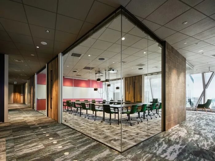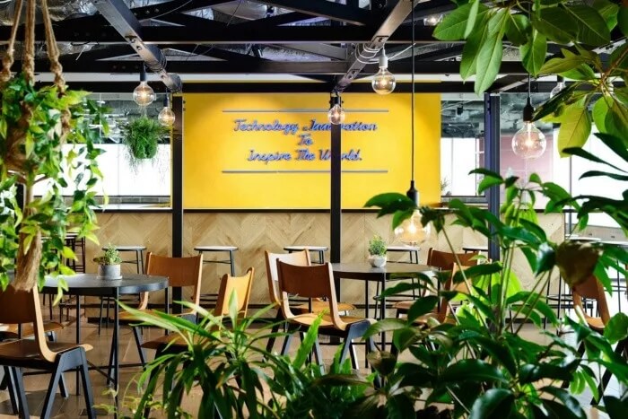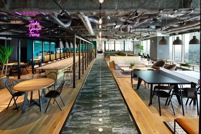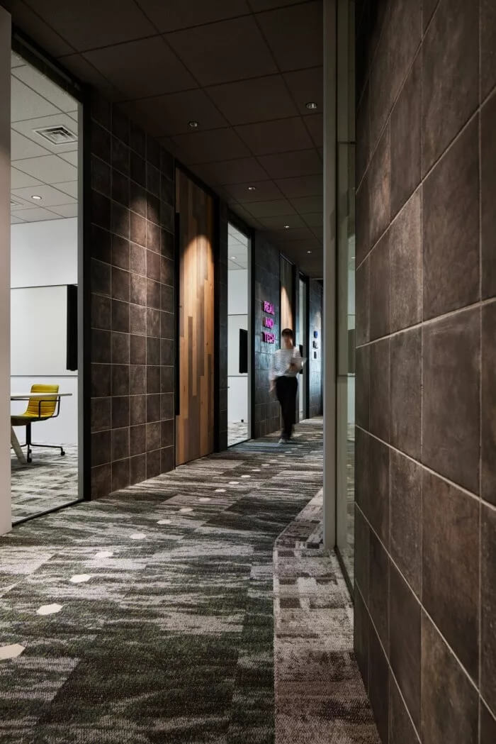 為此,設(shè)計團隊的目標是讓辦公室成為一個人們隨便可以咨詢房地產(chǎn)相關(guān)資訊的地方。入口處有許多綠植,寬敞的空間看起來比起居室還要舒服。辦公室配備了帶有防污圖案的框架,復古吊燈和帶有當下流行風格的霓虹燈標注,徹底改變房地產(chǎn)公司的傳統(tǒng)形象??臻g約有3300平方米,擁有20多件會議室,員工使用的公共空間介于工程師和代理商空曠的工作間之間。