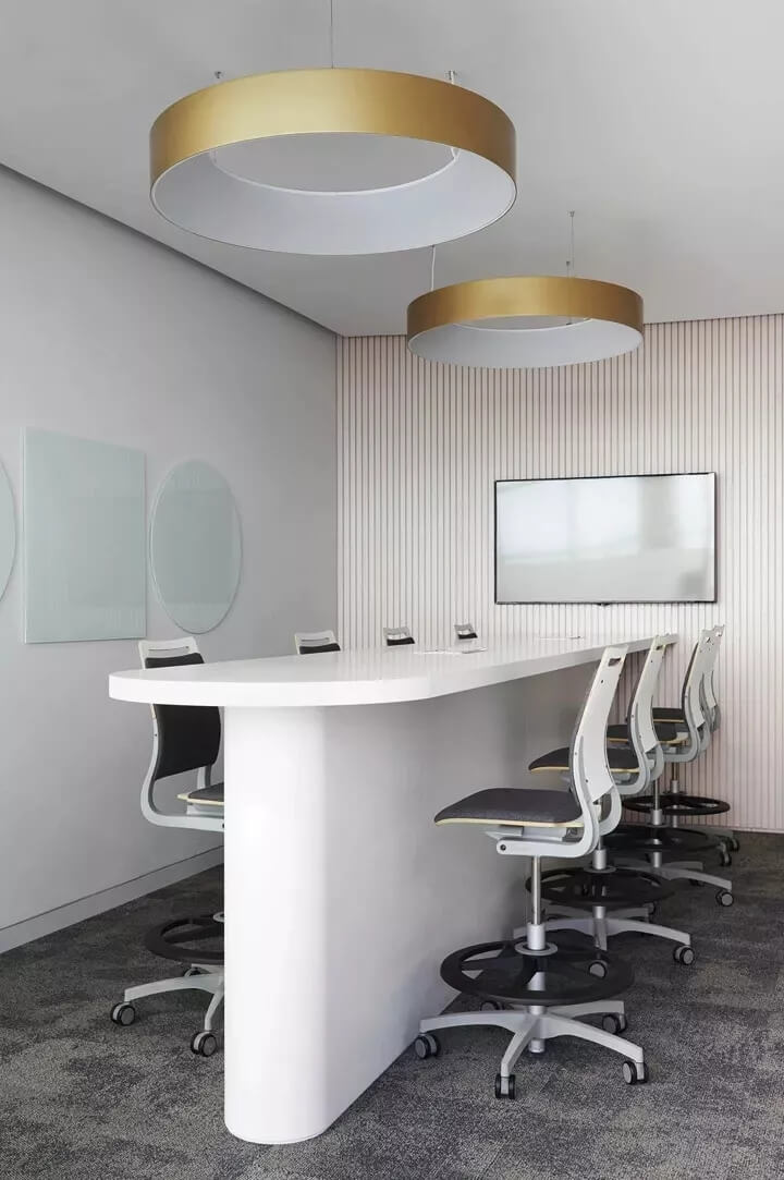 計(jì)概念的靈感來(lái)源于公司的名稱——L'or(法語(yǔ),意為gold金色)和aurele(法語(yǔ),意為halo光環(huán))。“金色光環(huán)”的品牌寓意成為整個(gè)空間形式的構(gòu)造背景,整個(gè)辦公室的主動(dòng)線也圍繞著一個(gè)圓環(huán)來(lái)規(guī)劃。這個(gè)中心圓環(huán)被定義為一個(gè)明亮的核心空間,形成一個(gè)中心會(huì)議大廳,周邊分布著或開放或封閉的會(huì)議區(qū)。