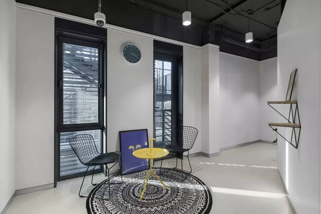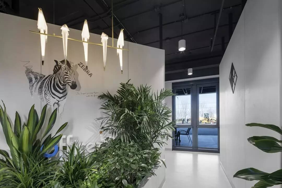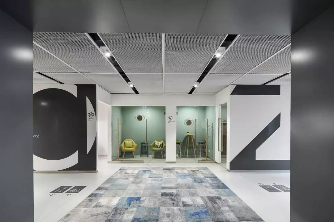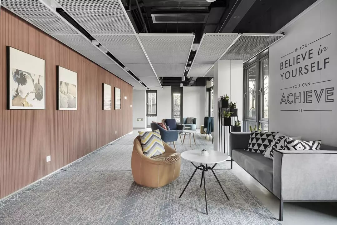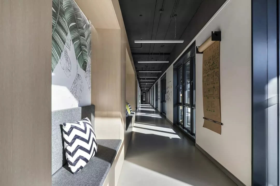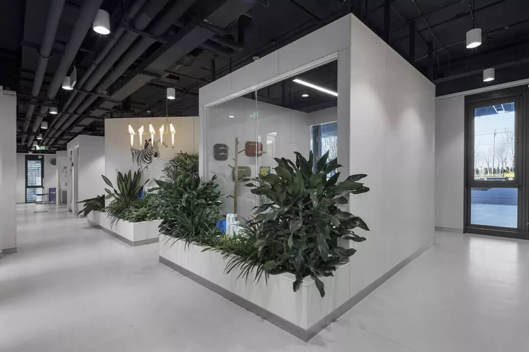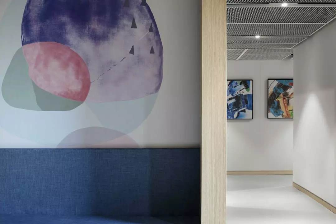 至于盒子以外的空間,我們想凝聚更多的人文藝術(shù)氣息,選擇較多地去鋪陳展示各種抽象的藝術(shù)線條和畫作,同時(shí)為了不失去生活氣息,各個(gè)角落選擇顏色比較跳躍的家居什物,讓它作為一個(gè)流動(dòng)的戶外廣場(chǎng),讓人可以自在穿行其中,偶爾停駐觀察,經(jīng)得住人聲鼎沸的喧擾,亦能提供心靈靜憩的安寧。在這里,大家認(rèn)真辦公、生活、盡情交流、分享,它就是一個(gè)安放綠意,有極高包容度的公共空間。