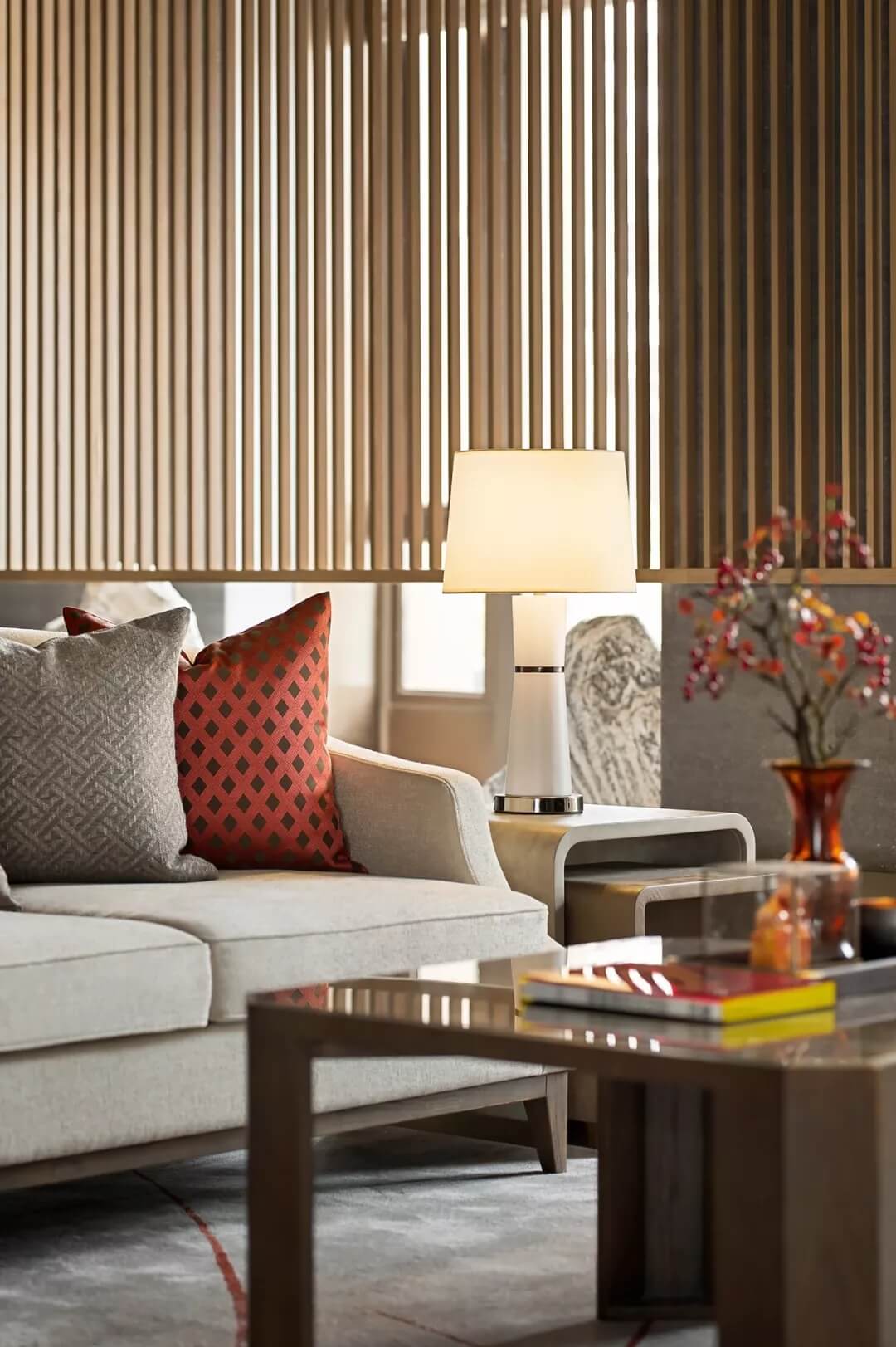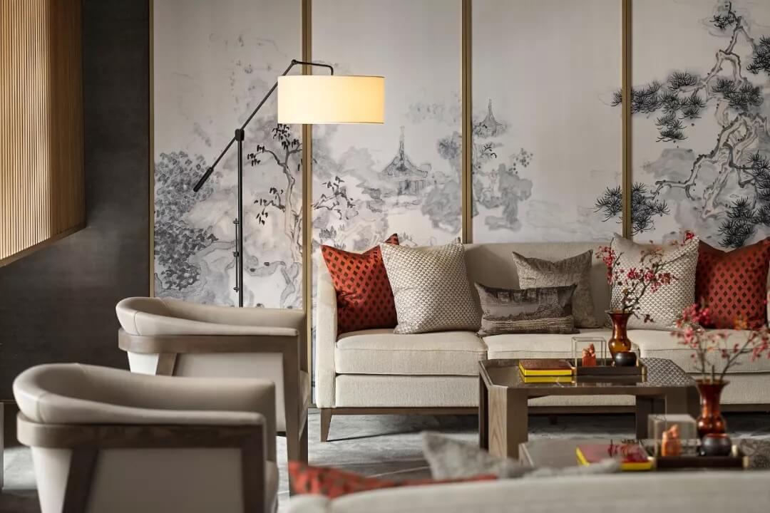屏風上“高山流水遇知音”,宛如在娓娓道來伯牙子期當年的故事。收藏級裝幀叢書,代表禮儀身份的印章,抱枕上的祥云、山水刺繡,細致精巧的陳設烘托出文人雅趣,同時營造了沉穩(wěn)靜逸的氛圍,堅定地表達了現(xiàn)代東方的美學態(tài)度。