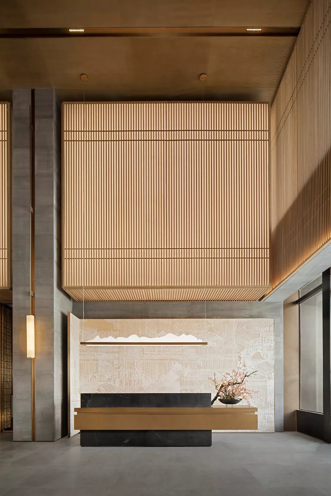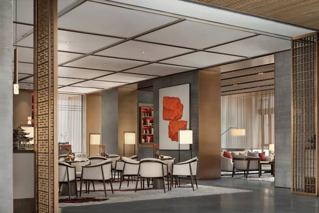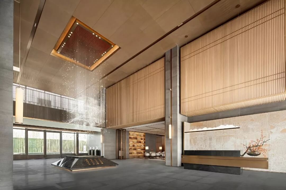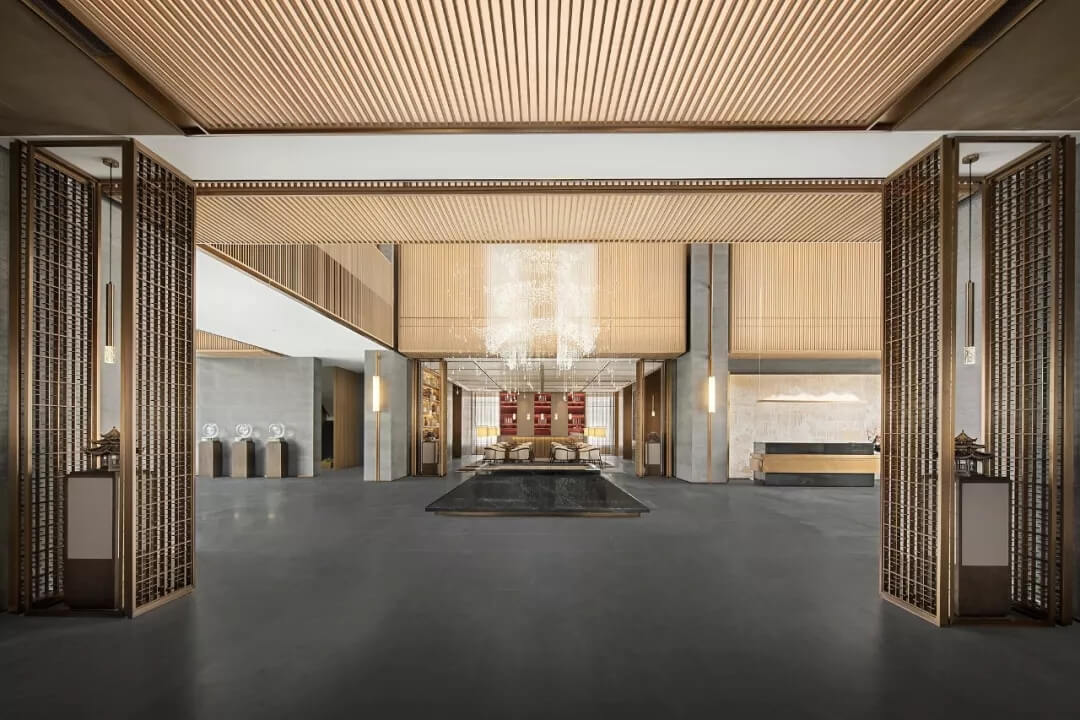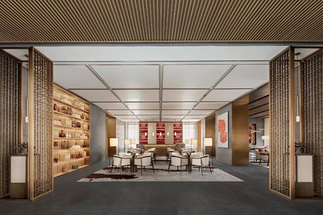 踏入第一重空間的迎賓前廳,大堂挑空高7.7米,氣勢恢宏。“甲第者以禮為官也,不學禮,無以立。”為此,迎賓區(qū)的設計干練簡潔,以飽含的禮儀序列拉開整個空間的序幕。