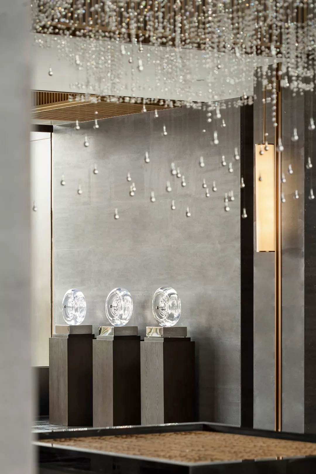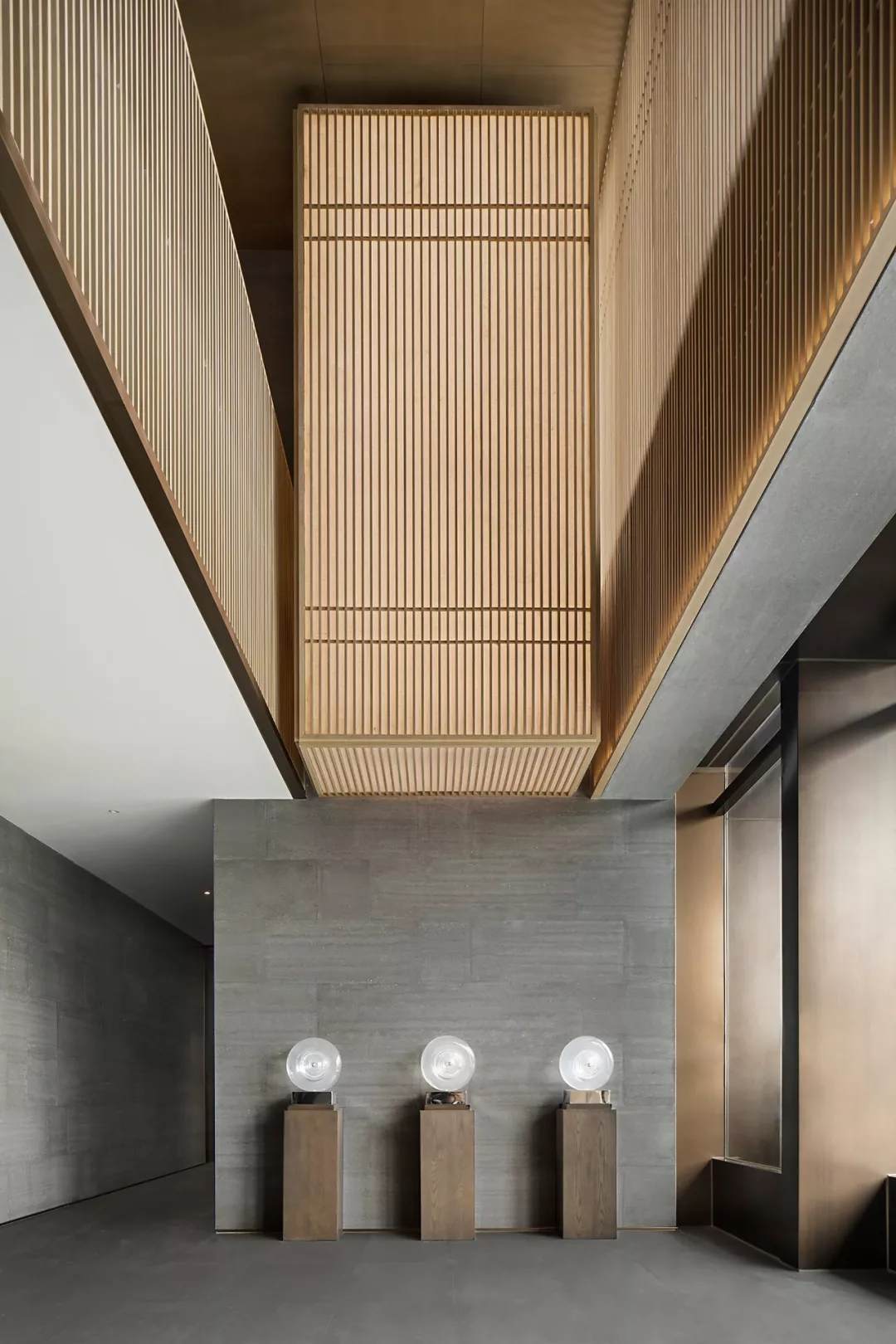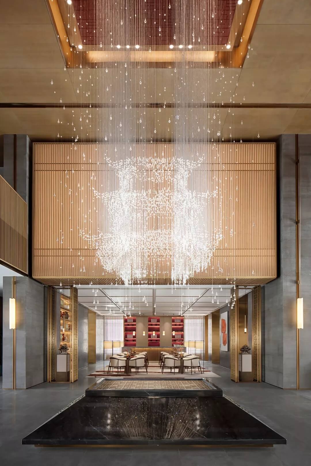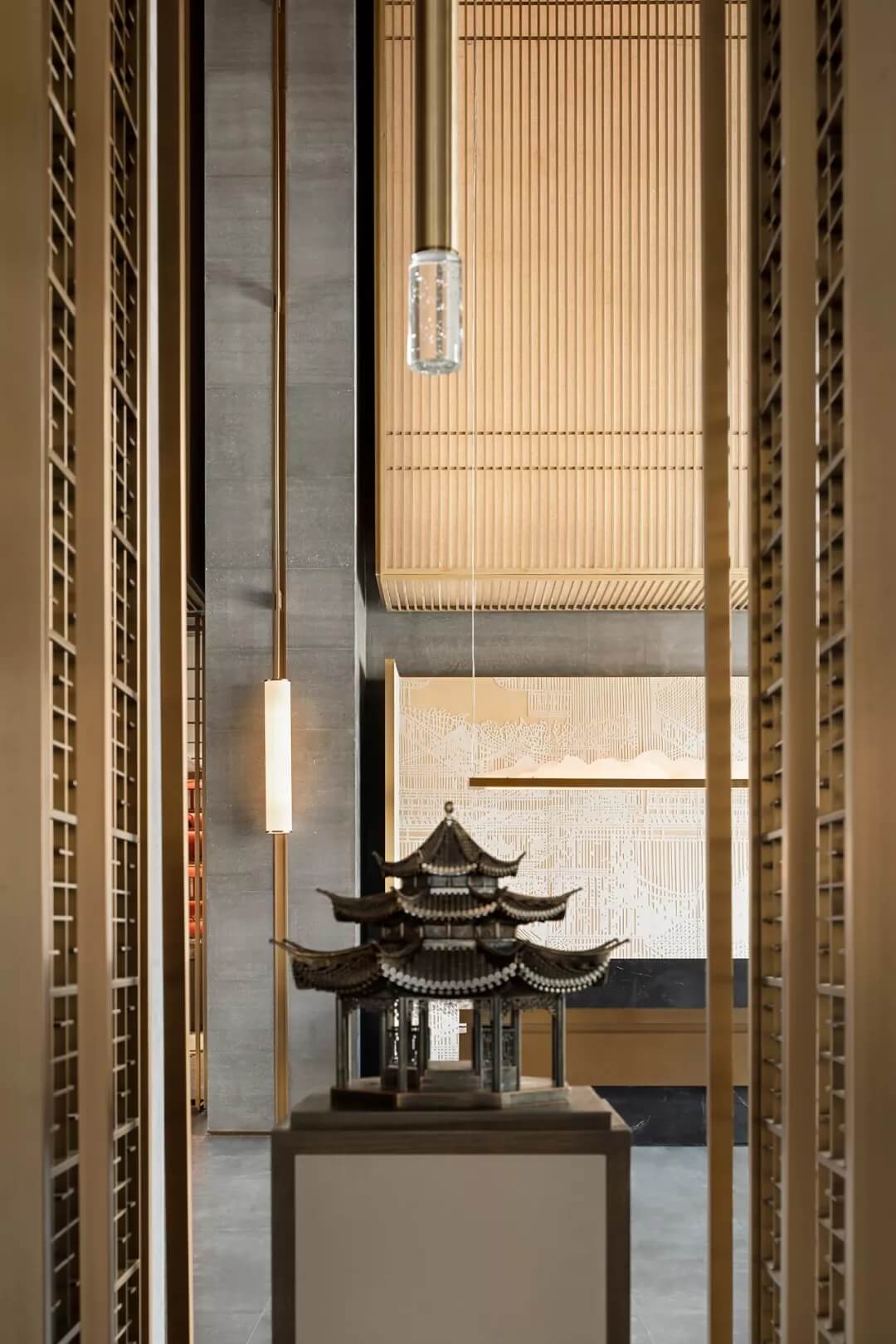 后廳兩端藝術裝置呈矩陣對稱分布,延續(xù)了古老東方的嚴肅審美。在材質多元的形態(tài)下,又極具層次變化。