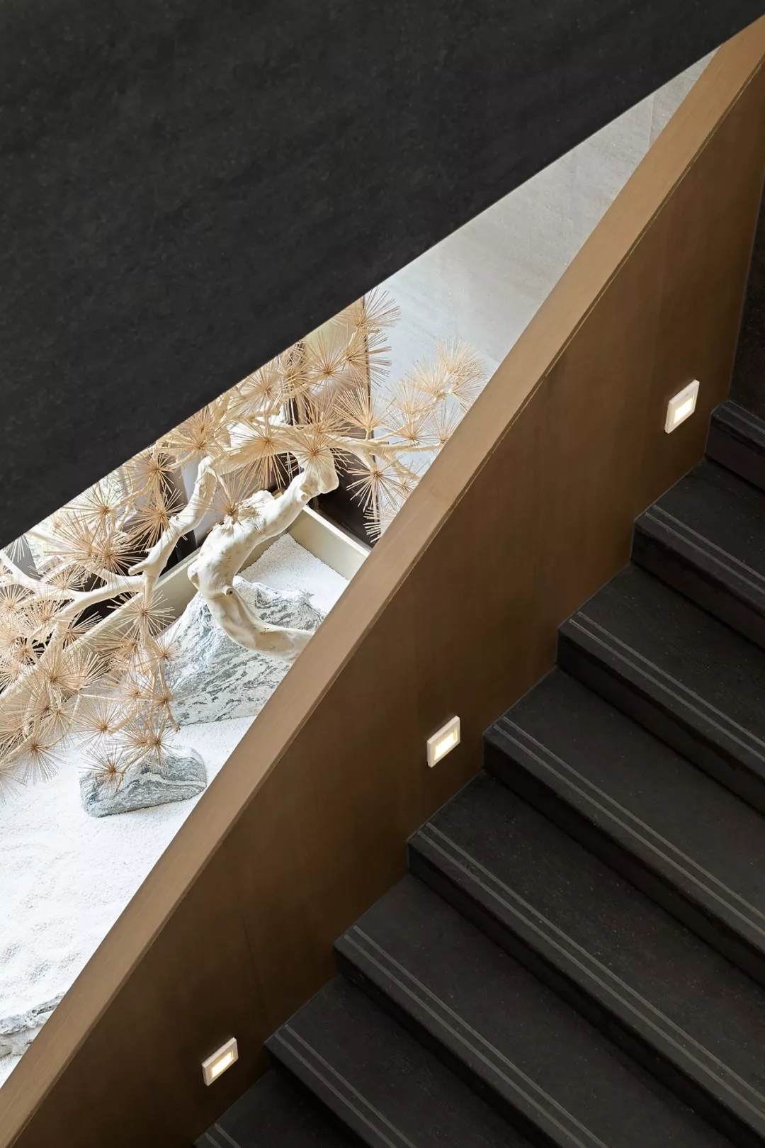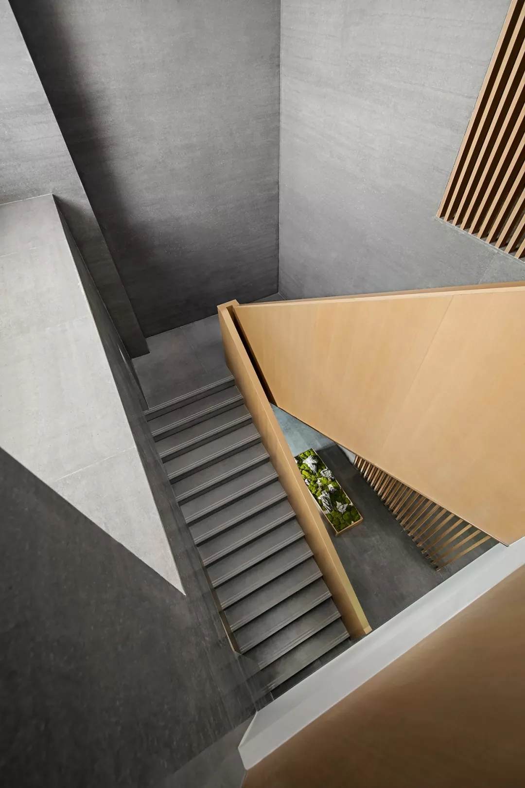 樓梯作為一層和二層VIP室的重要連接,強調建筑感,在一隅打造景觀顯露禪意,通過木飾面包裹更具整體性,簡潔有序,又釋放古雅風韻。