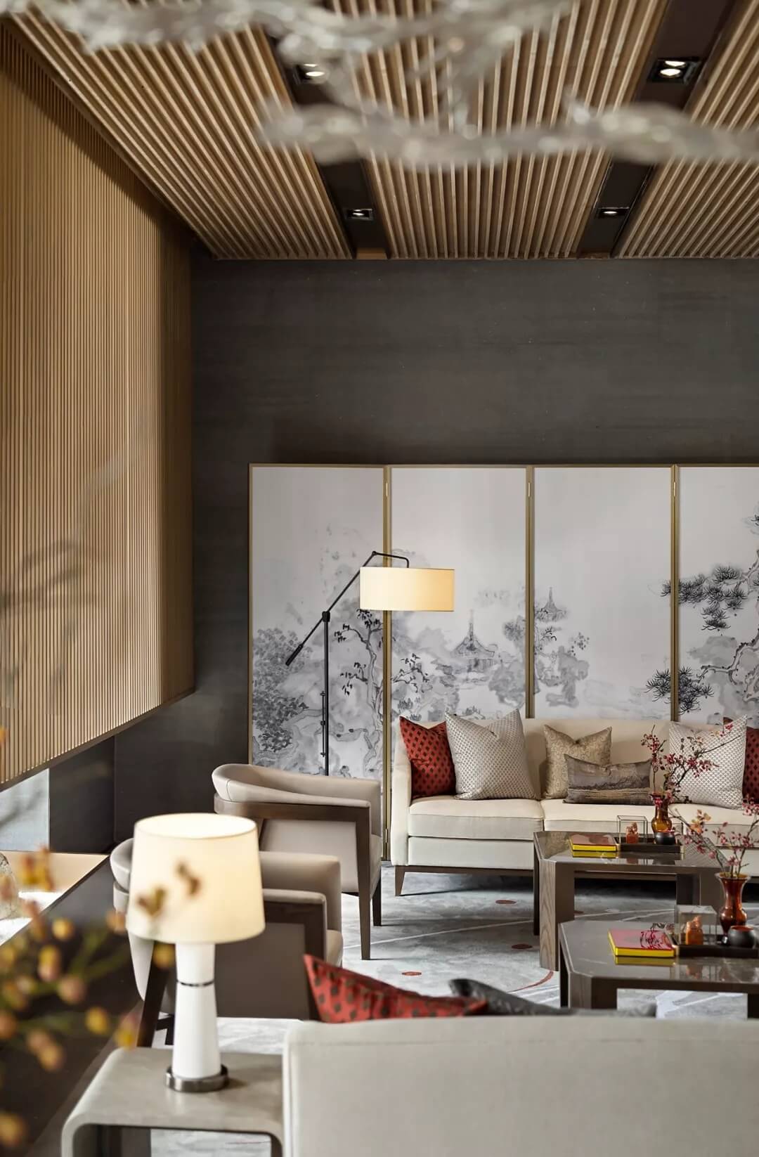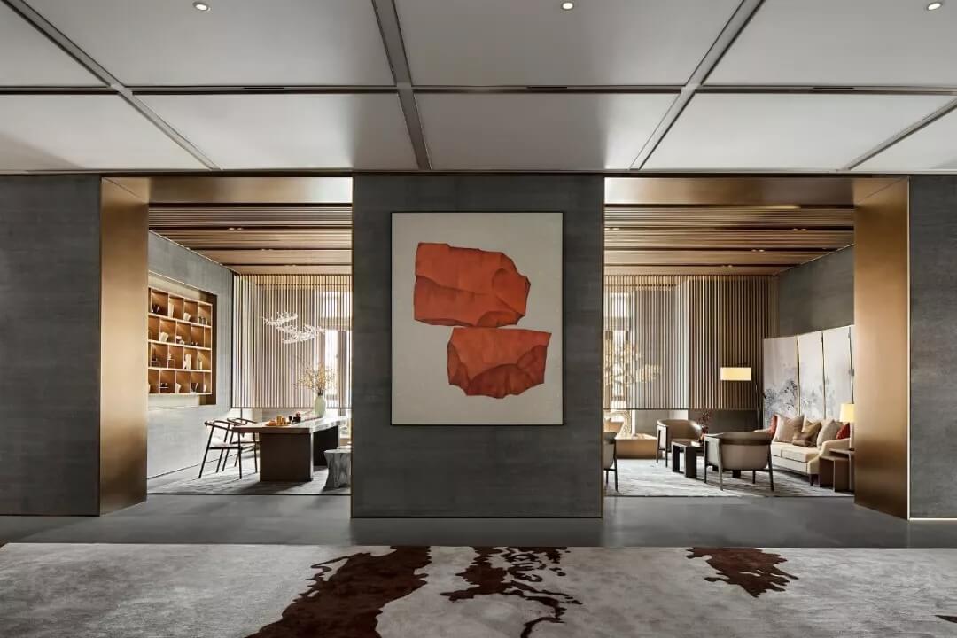 接待臺后方屏風采用香檳金木飾面打底,以浮雕般的技法將顏料手工涂抹之上,勾勒出亭臺樓閣、門坊巷院、宅第集群。臺面上的橘紅插花,講究枝葉的旁逸斜出,保留線條美與自然美,平添了一種沉靜之氣,將東方之意引入更悠遠的境地。