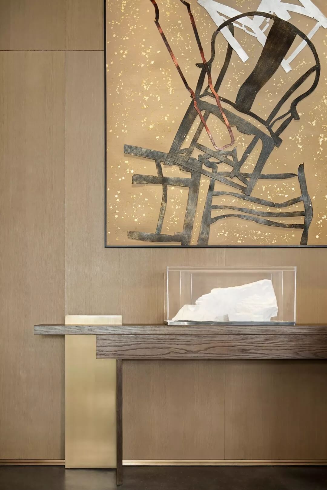 洽談區(qū)另一側的端景藝術畫與立面背景融為一體,畫作上由硬紙板雕刻出來的官椅層層疊加,以自由不羈的位置關系增添趣味。
