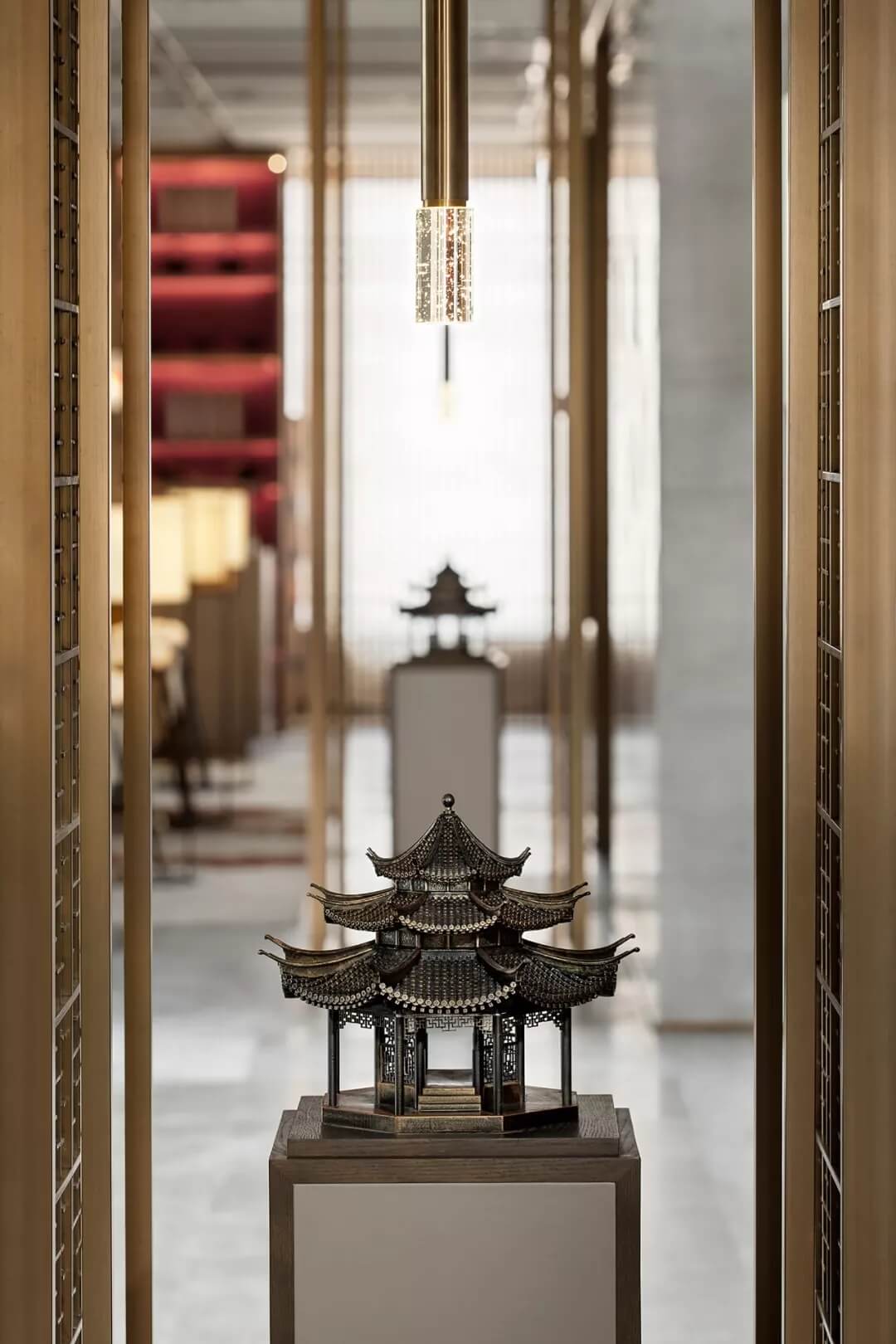 此外,八角亭作為官宅的建筑小品,自然也是不可或缺。設計師將黃鶴樓前的八角亭植入室內,運用3D打印技術,表面作特殊的工藝處理,實現(xiàn)古銅金屬材質的表達,詮釋出現(xiàn)代與傳統(tǒng)、傳承與發(fā)展的融合。