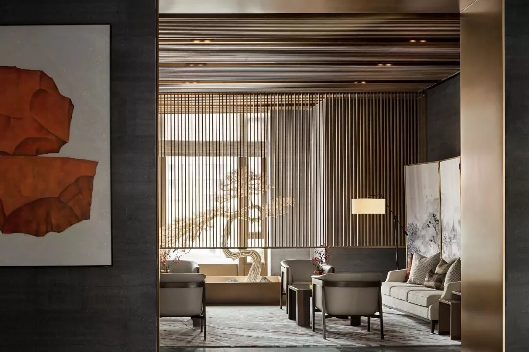 緊鄰淺度洽談區(qū)的一側,設立深度洽談區(qū)與品茗區(qū),在半開敞半私密的復合型布局中,木格柵材質以橫豎并存的姿態(tài)出現(xiàn),更具韻律節(jié)奏。此外還引入園林造景技法,虛透中亦可一窺山石松林,領略到“窗前有風景、心中有山水、茶中有天地”。
