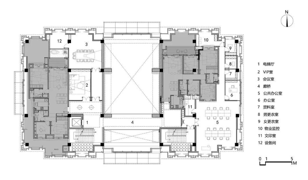 內部橫軸與縱軸兩條動線交叉,劃分出方正規(guī)整,卻又充滿開放互動式的功能分區(qū),這也是官宅建筑的題中之義??v軸動線上的兩側墻體向中心處略作延伸,上方木格柵內包裹燈箱一體貫穿而成,下方則以金屬屏風陣列來開啟兩端分區(qū)的儀式感。在燈箱、屏風的逐層隱退與縮進中,打破了空間的單調與空曠,立面視覺更加莊重大氣。