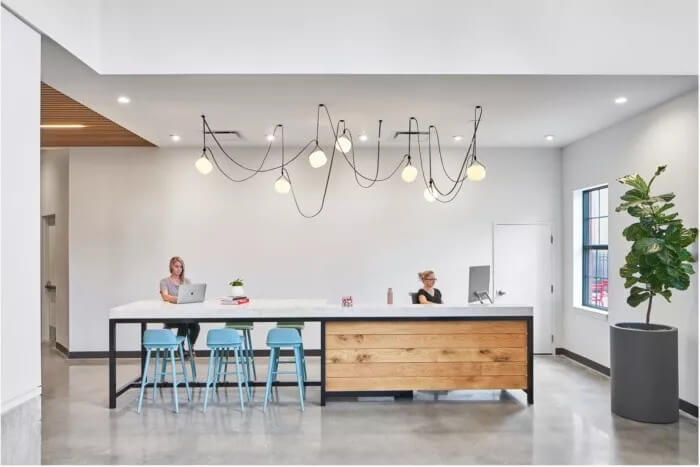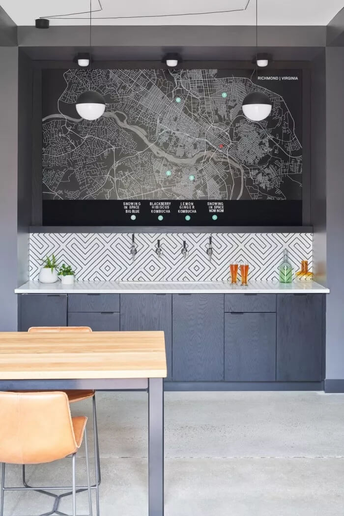 曾經(jīng)被濫用的中庭被重新構(gòu)想成該機(jī)構(gòu)的心臟-充滿活力的會議區(qū)和一間酒吧,設(shè)有來自里士滿地區(qū)的旋轉(zhuǎn)水龍頭。大堂取代了傳統(tǒng)的bun堡般的接待臺和獨(dú)立的休息區(qū),而是變成了一個畫廊—充滿活力,動感十足,并嵌入了里士滿的性格。還有接待處?那個也被定制的鋼制桌子代替,該桌子可以兼作員工的共同工作空間。