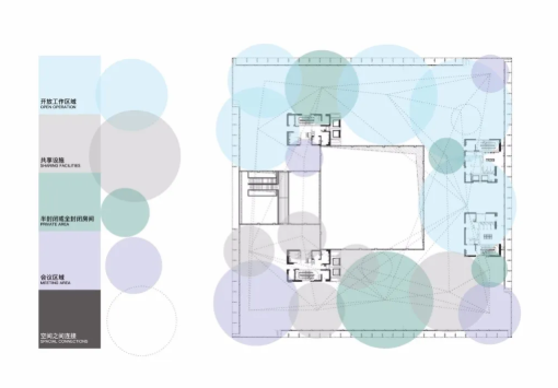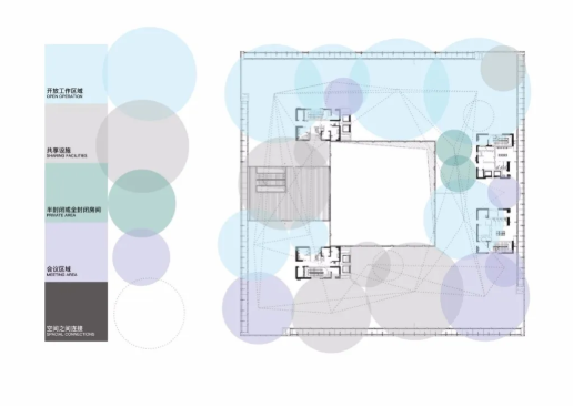 該項目的另一個重要的設計出發(fā)點是設計師期望將上海這個城市的活力與多樣性引入并轉化為工作空間的功能分布,因此,整個辦公室中從任意工位出發(fā)走到就近洽談