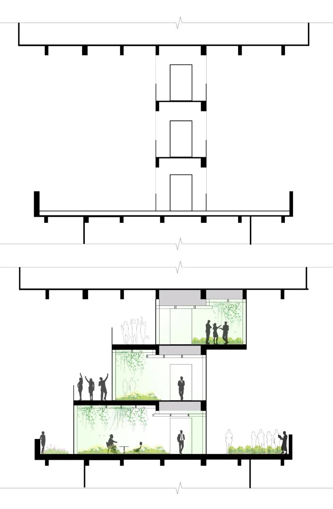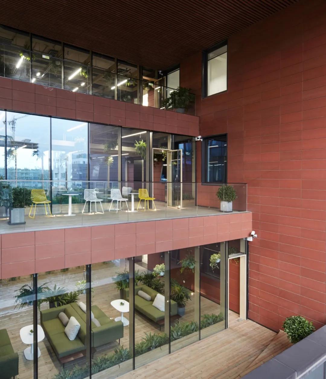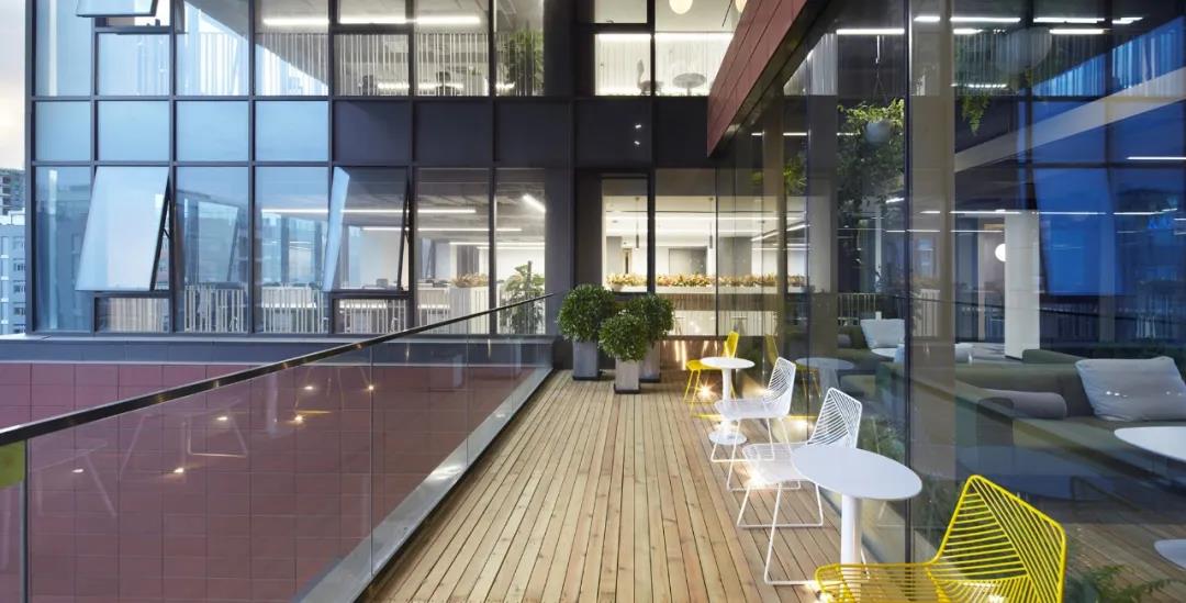 在建筑中段的4-6層,是一處半室外的連橋空間。通過結(jié)構(gòu)適度改造營建了三個(gè)疊落的空中花房,同時(shí)每個(gè)花房都配有戶外露臺作為空間延展。矩陣型木質(zhì)天花延伸到側(cè)墻并落地,地面鋪防腐木條,整個(gè)空間配備綠植,營造輕松、生態(tài)的戶內(nèi)外休憩空間,同時(shí)還可作為研討,舉辦小型活動的多功能空間使用。