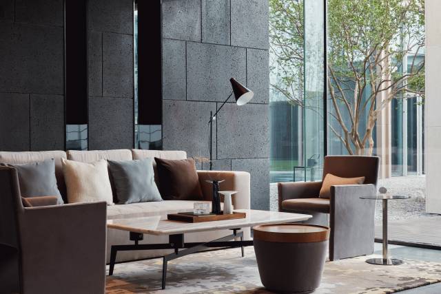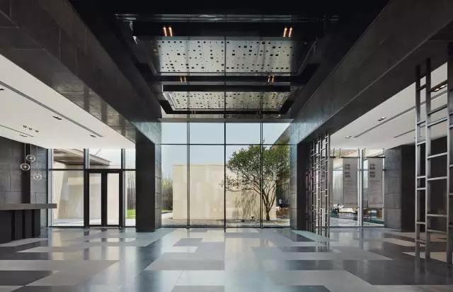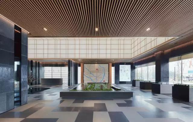 步入大廳,通過(guò)“借景”手法,將頗具詩(shī)情畫(huà)意的東方園林之景鋪呈在眼前,一抹翠綠更是讓整個(gè)空間靈動(dòng)起來(lái),巧妙而又極具視覺(jué)沖擊。在陽(yáng)光照射下,投影又成為景觀的一部分,展示出自然與建筑的互動(dòng),活躍且適宜。一大排落地窗串聯(lián)起室內(nèi)外關(guān)系,正是光線的引入,讓建筑、景觀、室內(nèi)形成有序的一體。沿著預(yù)接待吧臺(tái)的動(dòng)線向前穿引,便是整個(gè)銷(xiāo)控區(qū)域。