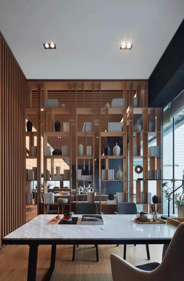 VIP區(qū)域原木色書(shū)架、豎向的木百葉有效阻隔區(qū)分空間,與周?chē)P(guān)系相互連接又互不打擾,形成半開(kāi)放式的私密空間,整體保證了空間的互動(dòng)性與獨(dú)立性。在這個(gè)“書(shū)卷留白筆墨濃”的區(qū)域,營(yíng)造出靜心一隅,構(gòu)筑具有人文氣息和品質(zhì)感的氛圍。