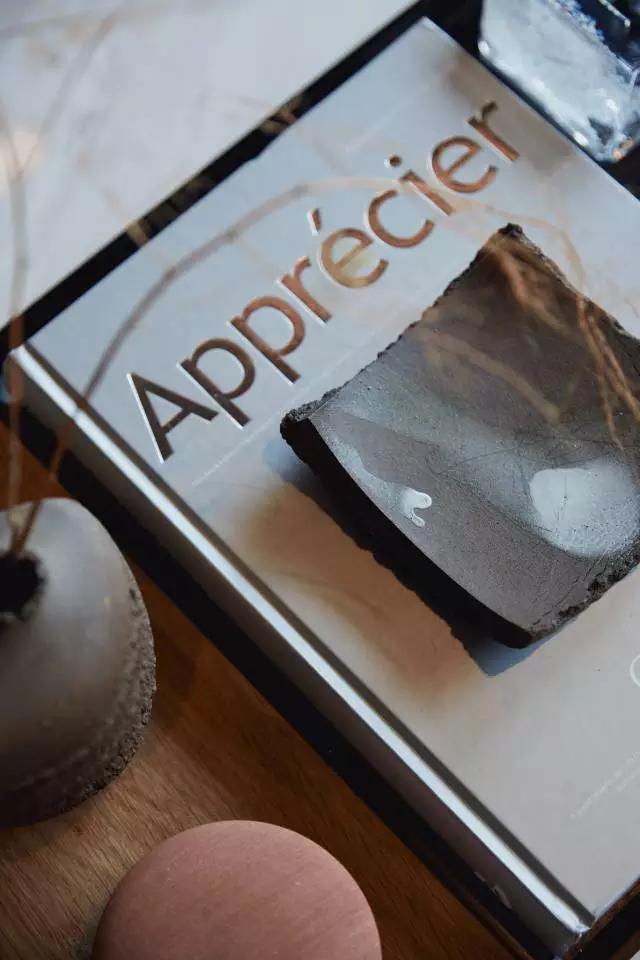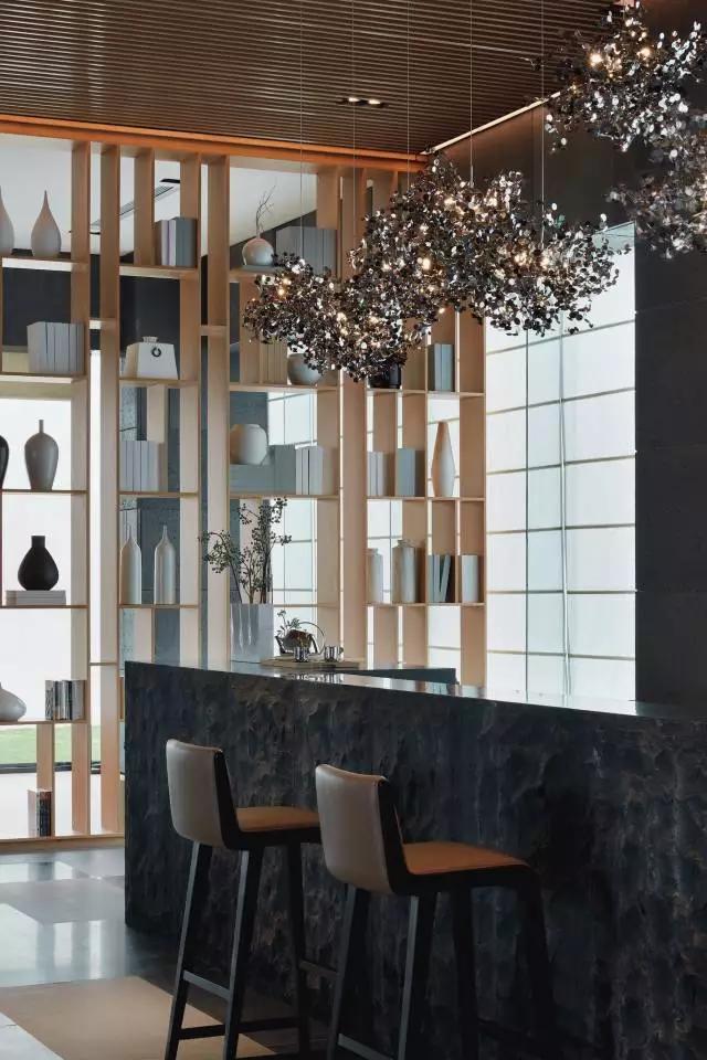 水吧臺(tái)以毛鑿面的形式呈現(xiàn),質(zhì)樸卻別具一格。而光線透射在吧臺(tái)頂面,又與書(shū)架、吊燈以及頂部的木百葉形成互動(dòng),勾勒出繽紛的空間輪廓。粗獷肌理感的石材,又與花瓣式的吊燈形成材質(zhì)上的鮮明對(duì)比,晶瑩璀璨。