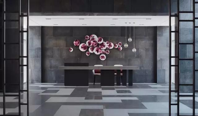 預(yù)接待吧臺(tái)與大廳講究整體的對(duì)稱平衡,通過(guò)巧妙的吧臺(tái)構(gòu)成形式、空間吊燈的位置,呈現(xiàn)靈動(dòng)的立面關(guān)系,有效緩解空間的呆板。大面積深灰色石材,配以紫色壁飾花瓣式鋪灑開(kāi)來(lái),夾雜一絲神秘感,東方韻味無(wú)限彌散。