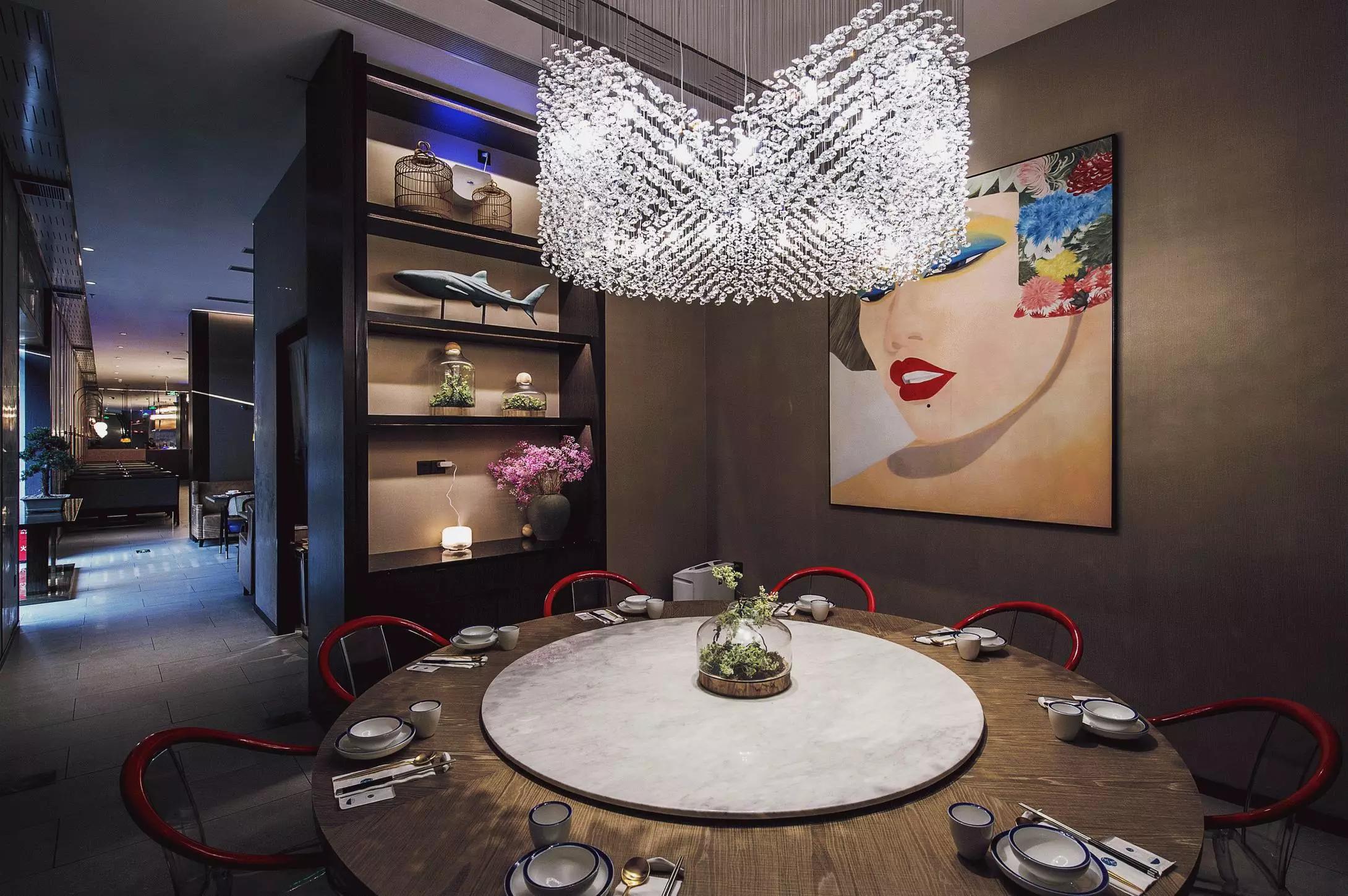 用餐區(qū)完全是一個開放的空間,沒有很多的隔斷,圓桌和方桌有序排布,既充分利用了空間又避免了單調,結合燈具的設計,就像在老家庭院里的大家庭聚餐——夜晚,歸來的親人們,在清涼的月色中,你來我往,和和樂樂,傳遞此間。